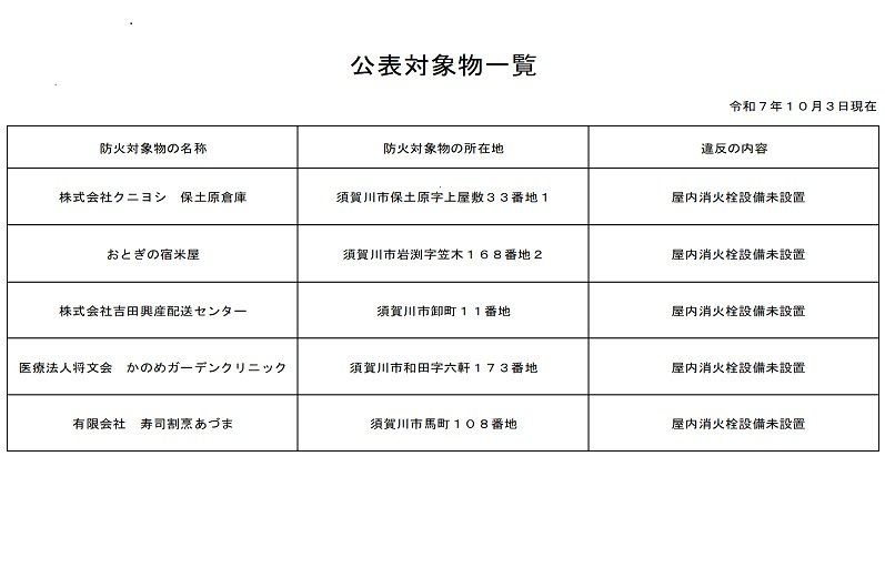 須賀川地方広域消防組合火災予防条例第52条に基づく防火対象物の消防用設備等の公表状況は次のとおりです。現在公表している違反対象物についてはこちらのPDFをご覧ください。